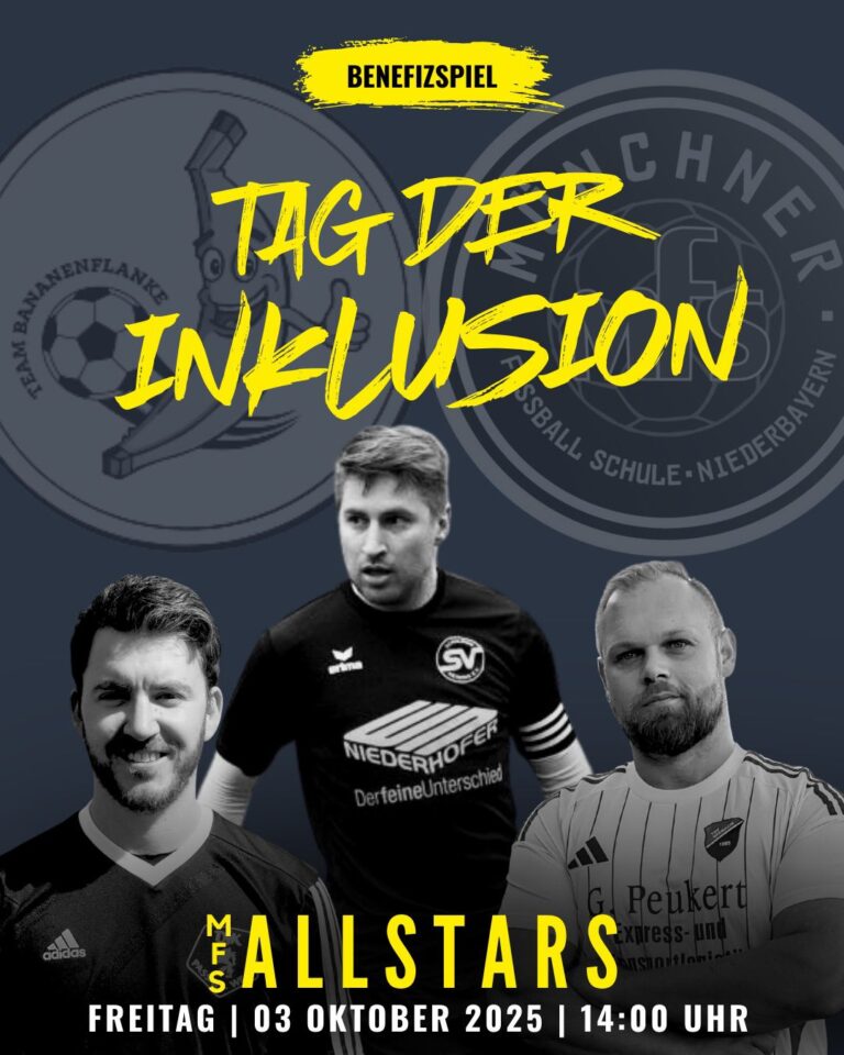 Am Freitag, den 3. Oktober 2025, findet ein besonderes Benefizspiel unter dem Motto “Tag der Inklusion” statt. Austragungsort ist der Sportplatz der DJK Vornbach. Die Begegnung zwischen dem Team Bananenflanke und den MFS Allstars startet um 14:00 Uhr. Unser Jugendtrainer Stephan agiert für die Allstars als rechter…