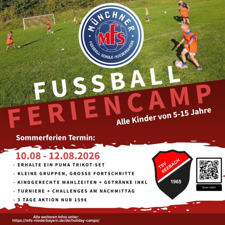 ⚽🔥Diesen Sommer ist in Seebach einiges geboten!🔥⚽ Erstmals im Raum Deggendorffindet vom 10.08. bis 12.08. das Fußballcamp der Münchner Fußballschule Niederbayern (MfS) statt.💙Wir freuen uns sehr, mit einem so starken Partner und seiner modernen Trainingsphilosophie zusammenzuarbeiten – denn unsere Kinder…